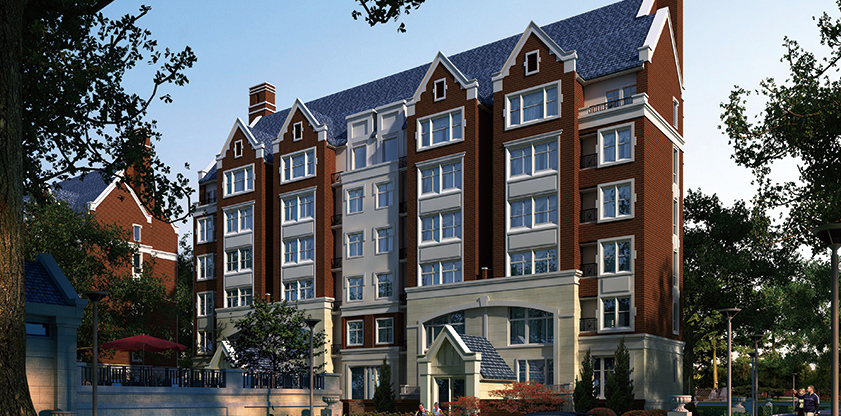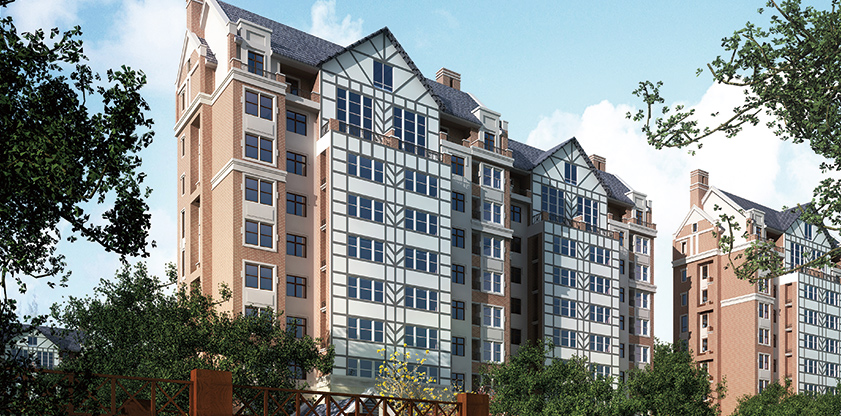 北側(cè)高層住宅立面采用現(xiàn)代風(fēng)格,簡潔大氣又不失韻律感與南面純正的英式建筑形成鮮明對比,交相輝映。